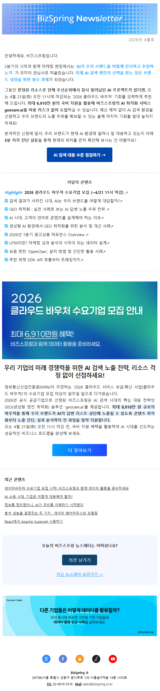 안녕하세요, 비즈스프링입니다. 2분기의 시작과 함께 마케팅 현장에서는 ‘AI가 우리 브랜드를 어떻게 인식하고 추천하는가’ 가 초미의 관심사로 떠올랐습니다. 이제 AI 검색 엔진의 선택을 받는 것은 브랜드 성장을 위한 필수 과제가 되었습니다. 그동안 한정된 리소스로 인해 우선순위에서 잠시 밀려났던 AI 프로젝트가 있다면, 오는 4월 21일(화) 오전 11시에 마감되는 ‘2026 클라우드 바우처’ 기회를 강력하게 추천해 드립니다. 최대 6,910만 원의 국비 지원을 활용해 비즈스프링의 AI 최적화 서비스 geocare.ai를 비용 리스크 없이 도입하실 수 있습니다. 본격적인 신청에 앞서, 우리 브랜드가 현재 AI 환경에 얼마나 잘 대응하고 있는지 아래 3분 자가 진단 설문을 통해 현재의 위치를 먼저 확인해 보시는 건 어떨까요?