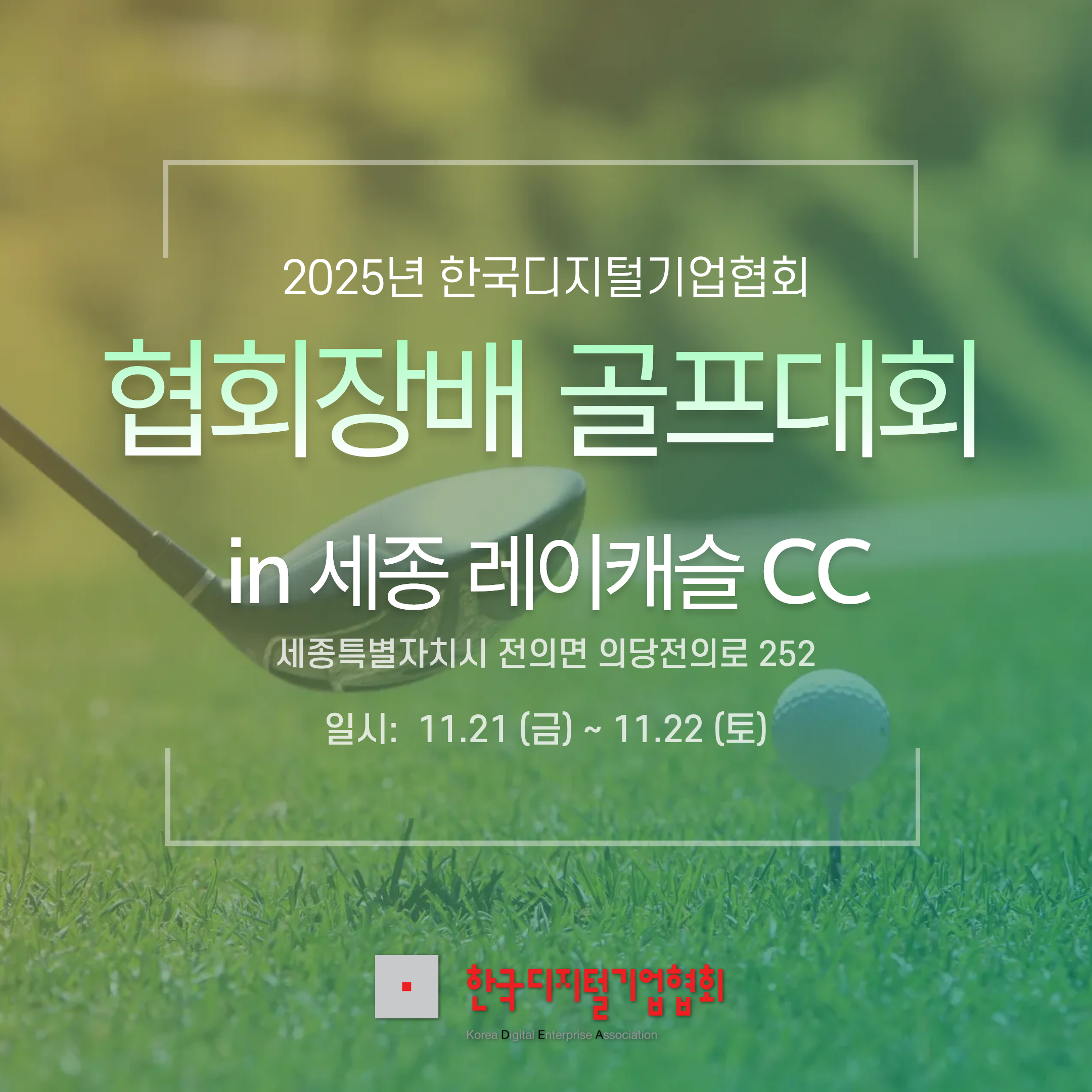 🏌️♂️2025 협회장배 골프대회 안내 안녕하십니까, 한국디지털기업협회 사무국입니다. 2025 협회장배 골프대회 일정을 안내드립니다. ■ 대회 일정 일정: 2025년 11월 21일(금) ~ 22일(토), 양일 간 장소: 세종 레이캐슬 CC (세종특별자치시 전의면 의당전의로 252) 숙박: 세종 레이캐슬 리조트 - 최고급 4인 1실 객실 (침실 2개, 침실 당 Twin Bed, 거실, 욕실 2개, 테라스) - 어뮤니티: 일반 수건 8장, 바스타월 4장, 샴푸,린스,바디워시, 드라이어, 비누, 스킨,로션) 제공 ※ 단, 칫솔, 치약 개별 준비가 필요 합니다. - 오찬 2회, 만찬 및 조식 제공 이동: 자차로 개별 이동 진행 ■ 시상품 협찬사 및 시상품 소개 협찬사 대표 협찬 내용 리노커뮤니케이션즈 김상연 협회장 거리측정기 와일리 박수인 수석부회장 해원단 3박스 (판매가 박스 당 32만원 상당) 엠피알디플러스 차신준 대표 (클럽다이아 회장) 타이틀리스트 캐디백 인터렉티브 빅 임동일 대표(클럽다이아 운영위원장) 영광 굴비 3세트 맥플러스 김형섭 대표(클럽다이아 총무) 타이틀리스트 보스턴백 인픽스 이현우 대표 대회 1위 NumNum 트로피 협찬 PCN 송광헌 대표 PXG 퍼터 인크로스 손윤정 대표 한우 4세트 프릭스 박삼성 대표 거리측정기 앤드와이즈 고경구 대표 경옥고 스틱 4세트 라이트브레인 황기석 대표 스탠리 대형텀블러 3개 플림커뮤니케이션 이병하 대표 티더블유지 크림카라멜티 2박스 윤커뮤니케이션즈 펜타브리드 게티이미지코리아 윤여주 대표 박태희 대표 윤춘희 대표 실속만점 상품권(20만원) EOMOM 바디드라이어 타이틀리스트 골프공 3박스 (12구 1박스) 진투코리아 김상준 대표 타이틀리스트 골프공 10박스 (하프더즌) ※협찬해주신 모든 대표님들께 감사의 말씀을 드리며, 즐거운 행사가 될 수 있도록 하겠습니다. 감사합니다. ■ 행사 개요 대회명: 2025 협회장배 골프대회 주최: (사)한국디지털기업협회 / 클럽다이아 행사내용: 골프대회 및 시상식 이번 협회장배 골프대회는 한 해를 마무리하며 회원사 대표 및 임직원분들이 함께 즐길 수 있는 뜻깊은 자리로 준비되었습니다. 많은 회원사분들의 참여와 관심을 부탁드립니다. 📞 문의: 010-8921-2339 📧 이메일: master@dea.or.kr |jmc@dea.or.kr