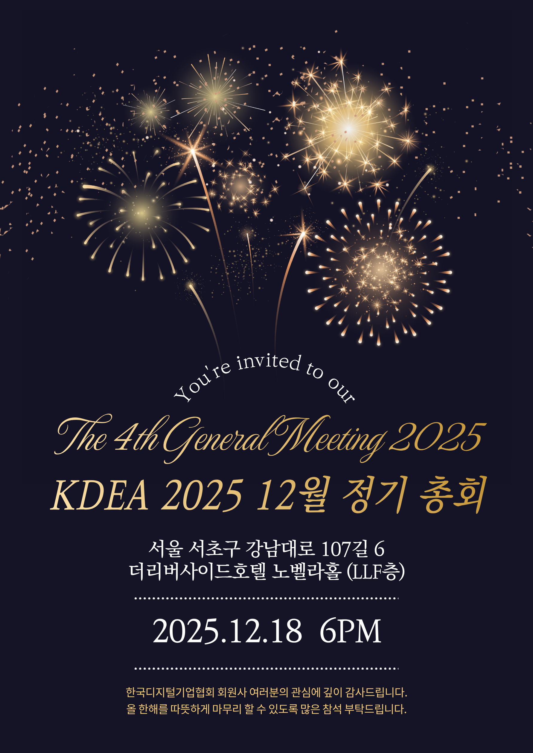 안녕하세요. 한국디지털기업협회 사무국입니다. 협회는 매주 화요일 디지털 업계의 주요 뉴스와 산업 트렌드, 그리고 회원사 및 협회 소식을 모아「KDEA 뉴스레터」로 전해드립니다. 💌 회원사 참여 안내 회원사 여러분께서도 함께 나누고 싶은 소식이 있으시다면 아래 메일로 편하게 회신해 주시기 바랍니다. 📧 소식전달 및 문의: master@dea.or.kr|02 - 3462 - 5627 🌐 외부 보도자료가 아니어도, 귀사 게시판·홈페이지 등에 게시된 자체 소식 링크도 환영합니다. 항상 협회 활동에 보내주신 관심과 성원에 감사드립니다. 한국디지털기업협회는 앞으로도 회원사분들에게 실질적인 지원과 소통을 이어가겠습니다. 감사합니다. 한국디지털기업협회 사무국 드림